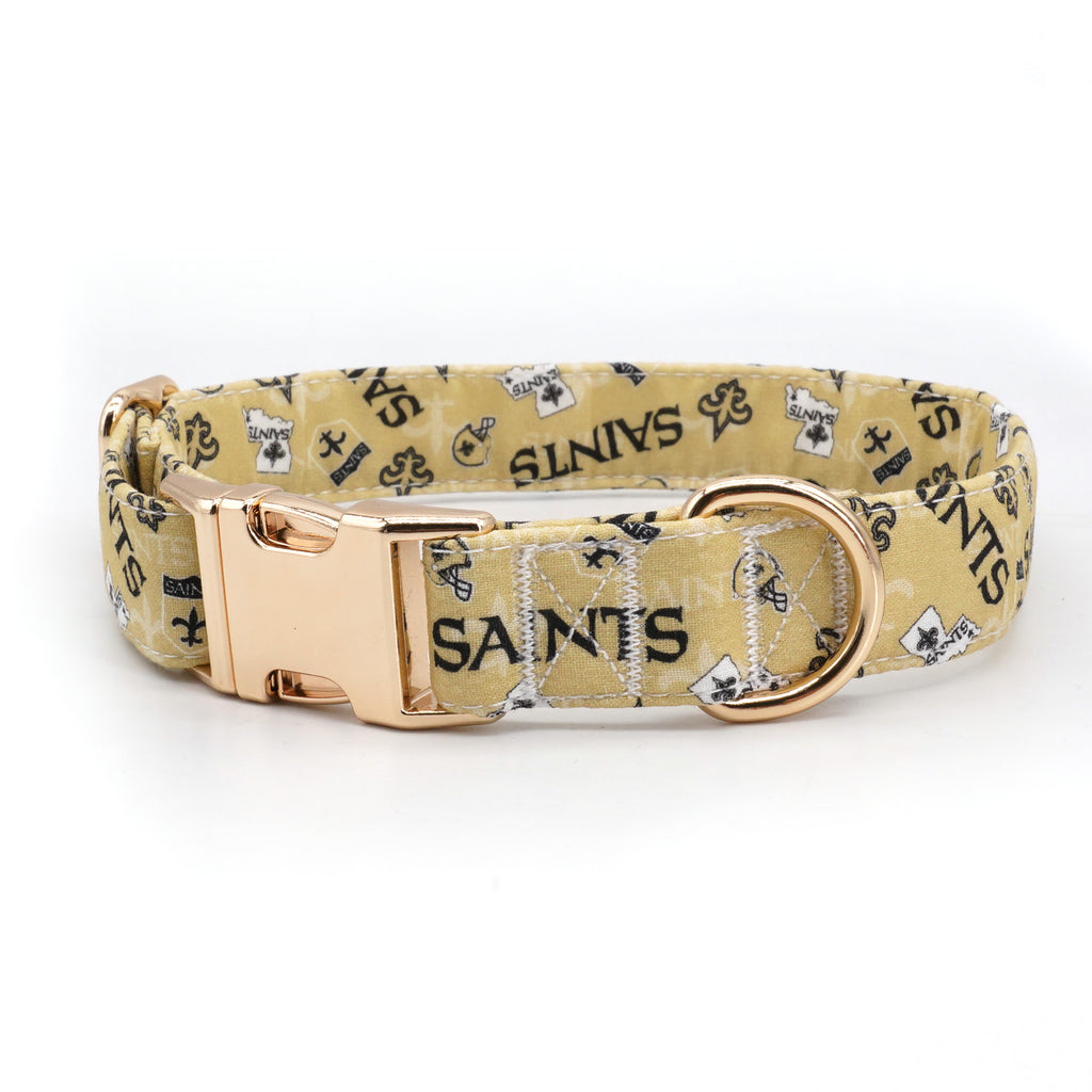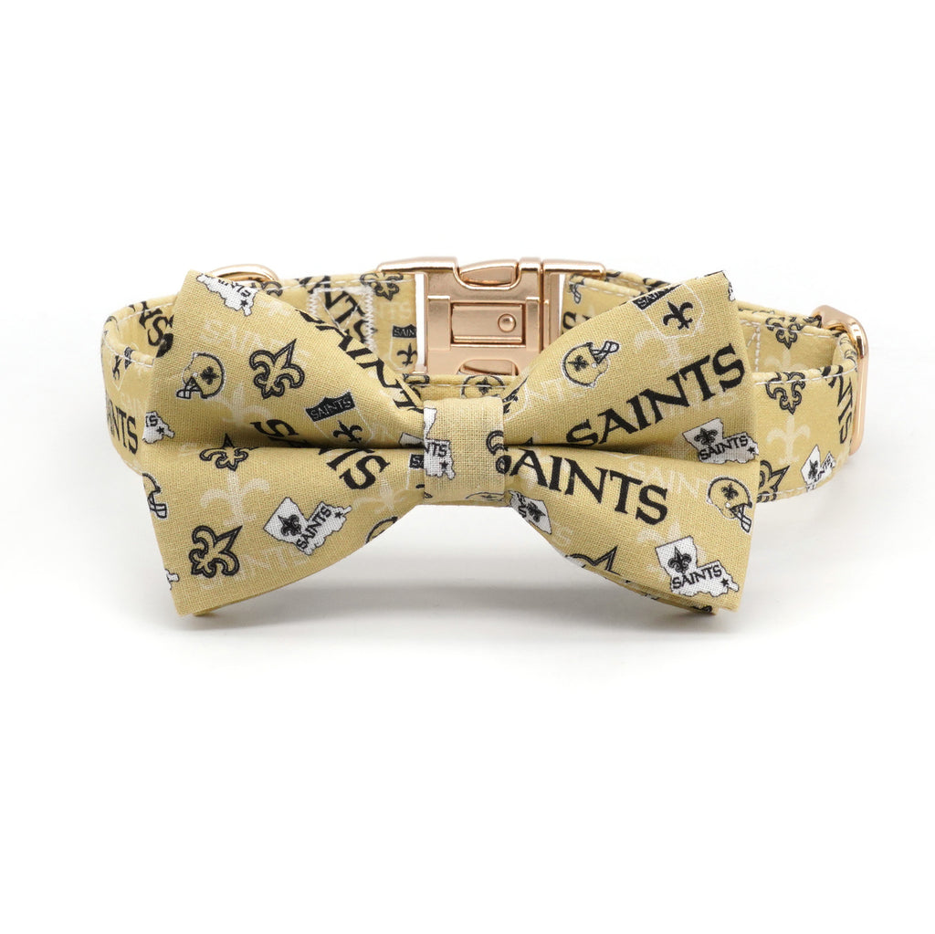 Look classy and adorable at the same time with the "Saints Collar Set". This collection is the perfect staple for every pet's wardrobe. 100% cotton fabric with luxe classic metal hardware. Our adjustable dog collars include a removable bow with elastic snap attachments, giving you the option to dress the collar up or down.
